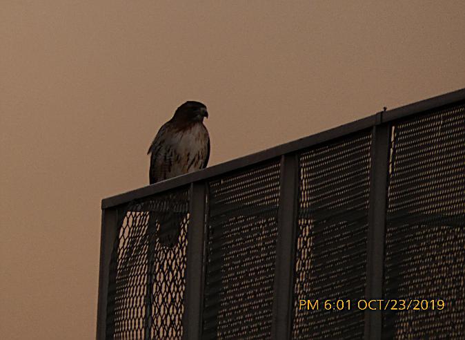 | Hawk sitting on railing on roof of Mandalay building on a cloudy & rainy Sunday. It stood on perch for hours. |