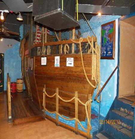 | Represents a ship used to transport slaves from Africa. An exhibit on how slaves were transported can be seen inside this "ship". |