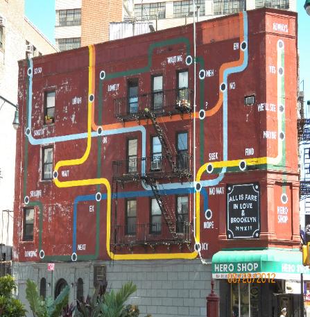 | Left - View of the former Williamsburgh Savings Bank building (clock on steeple) from entrance to Museum. Right - Building on Livingston & Boerum. Have no idea with that design on wall means! |