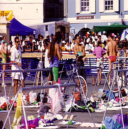 | At left, you have the spectators enjoying the parade. After the parade it was time to eat pasteles! (Photo of pasteles appears on another page.) |