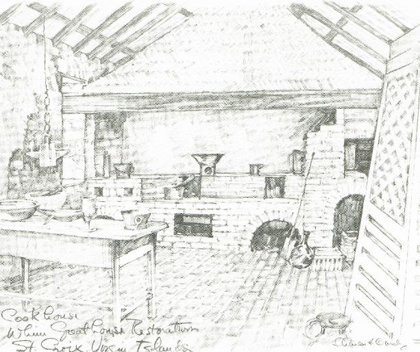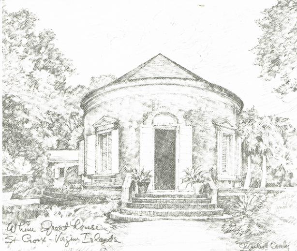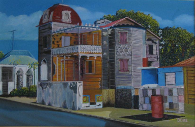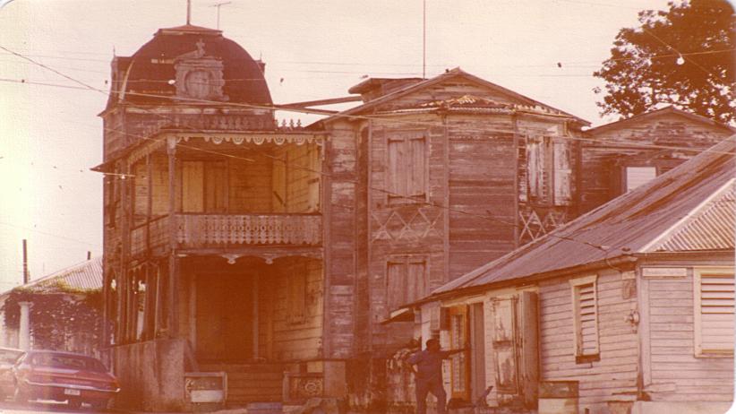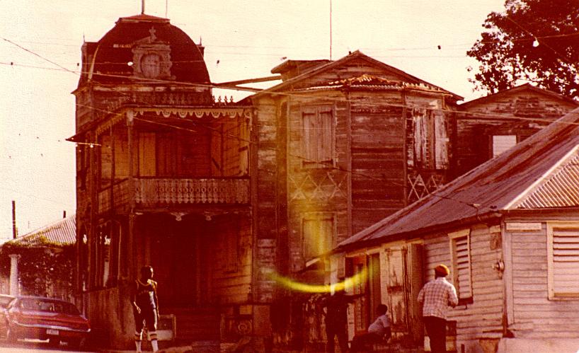 Durant Tower, King Street. This photo was taken in January 1980 from the Queens Cross Street corner. The Tower nor the small building no longer stand. The man with the hat on the extreme right looks like Dove, an excellent Crucian artist. Below appears a second photo taken the same day but with no yellow streak and not as red. Unfortunately, I never got to see the inside of this house. In 1980, it had already begun to deteriorate and eventually burned down. The hurricanes that would hit St. Croix beginning in 1989 finished it off. |