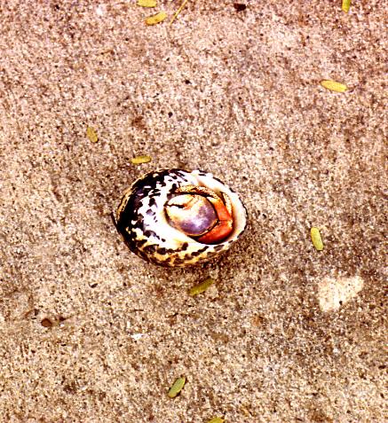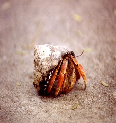 A Hermit Crab, in and out of its shell. On St. Croix it is called Soldier (Soulja) Crab. |